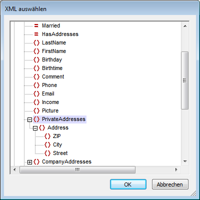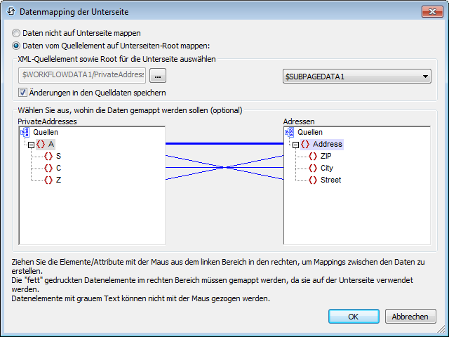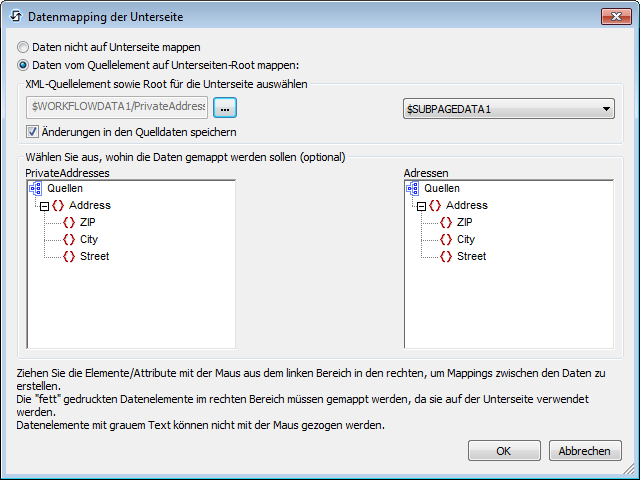 •Um die zu mappende Toplevelseiten-Seitenquelle auszuwählen, klicken Sie zuerst oberhalb des (linken) Toplevel-Seitenbereichs auf die Schaltfläche Zusätzliches Dialogfeld. Daraufhin wird das Dialogfeld "XML auswählen" (Abbildung rechts oben) aufgerufen, welches alle Seitenquellen der Toplevel-Seite enthält. Wählen Sie den Node aus, der auf die Daten der Unterseite gemappt werden soll. In der Abbildung oben wurde im Dialogfeld "XML auswählen" der Node PrivateAddresses ausgewählt. Aufgrund dessen werden die Nachfahren von PrivateAddresses im Quellstrukturbereich der Toplevel-Seite angezeigt und oberhalb des Bereichs wird PrivateAddresses, der gemappte Node, angezeigt.