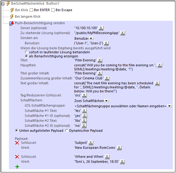 Wenn der Benutzer in der empfangenden Lösung auf eine PN-Schaltfläche tippt, wird die ID dieser Schaltfläche automatisch als Wert des $MT_PUSHNOTIFICATION/Root/@button-Node eingegeben (siehe Struktur der Seitenquelle weiter unten). Wenn ein Benutzer also auf die Schaltfläche #1 tippt, erhält der Node $MT_PUSHNOTIFICATION/Root/@button die ID der Schaltfläche #1. Mit Hilfe von bedingten Anweisungen, die den Wert dieses Node überprüfen, kann je nachdem, auf welche PN-Schaltfläche der Benutzer getippt hat, eine Gruppe von Aktionen ausgeführt werden. Diese bedingten Aktionen sind im BeiEmpfangVonPushBenachrichtigung-Ereignis der empfangenden Lösung definiert.