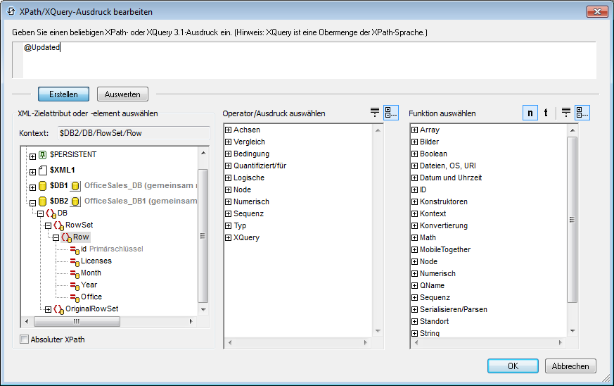 Wenn nun die Aktualisierungs-Nodes die @Updated-Attribute aller Row-Elemente wären und wenn der XPath-Ausdruck für den Aktualisierungswert genauso wie im vorherigen Beispiel lauten würde: