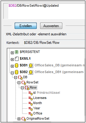 •Würde der XPath-Ausdruck geändert, sodass der @Updated-Node ab dem Root-Node adressiert würde (wie in der Abbildung unten folgendermaßen: $DB2/DB/RowSet/Row/@Updated), so würden die @Updated-Nodes aller Row-Elemente aktualisiert.