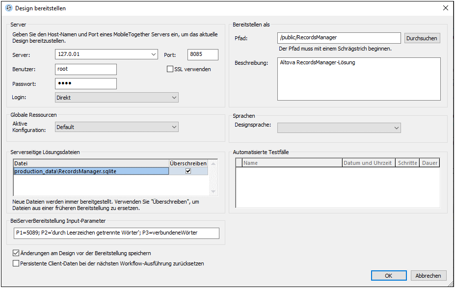 Füllen Sie die Datenfelder im Dialogfeld aus, wie unter Auf MobileTogether Server bereitstellen beschrieben.