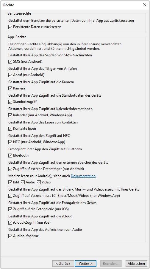 Sie können einstellen, ob der Endbenutzer persistente Daten zurücksetzen darf oder nicht. App-Rechte sind Rechte, die das Betriebssystem des Mobilgeräts der App einräumt. Die Rechte, die Sie hier auswählen, werden in der Manifestdatei der App gespeichert. Bei der Installation der App überprüft das Gerät die Manifestdatei der App und informiert den Endbenutzer über die Rechte, die für die App benötigt werden. Wenn der Endbenutzer diese Rechte gewährt, so wird die App installiert und die angeforderten Rechte werden der App eingeräumt. Wenn das Design z.B. eine Aktion SMS senden enthält, so wird dieses Recht standardmäßig vordefiniert und kann nicht geändert werden. "Standortzugriff" bezieht sich auf die GPS-Standortdaten des Mobilgeräts. In der Abbildung oben werden Standortfunktionen verwendet, daher wird Zugriff auf die Standardinformationen des Geräts benötigt. Aufgrund dieser Tatsache ist das Recht Standortzugriff automatisch ausgewählt und kann nicht geändert werden.