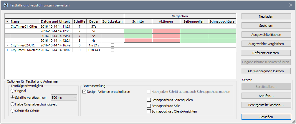 Im Dialogfeld wird jeder aufgezeichnete Testfall sowie die damit verknüpften Testausführungen (Wiedergabevorgänge) zusammen mit den relevanten Daten angezeigt. Datum und Uhrzeit sowie andere relevante Client-Einstellungen, wie z.B. Sprache, stammen vom Client-Gerät.