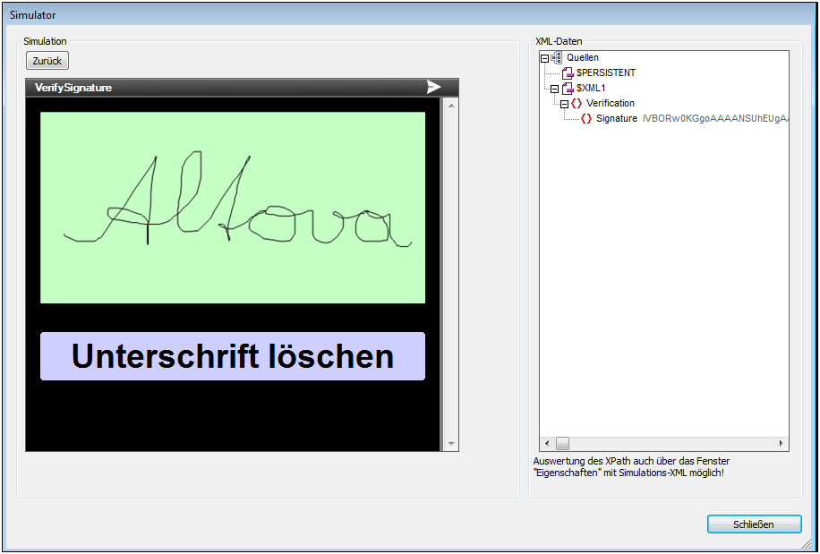 3.Testen Sie die Schaltfläche in einer Simulation. Beachten Sie in der Abbildung oben, dass die Bilddaten der gezeichneten Unterschrift im Node Signature gespeichert werden. Die Abbildung unten entstand, nachdem auf die Schaltfläche geklickt wurde. Wie Sie sehen, wurde der Node gelöscht und das Unterschriftfeld somit geleert.