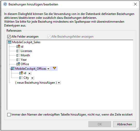 •Wenn Sie die Option Alle Beziehungsfelder anzeigen, aktivieren, werden nur die Spalten, die Beziehungen aufweisen, angezeigt. Wenn Sie die Option Alle Felder anzeigen aktivieren, werden alle Felder aller Tabellen/Ansichten angezeigt. Wenn beide Optionen deaktiviert sind, werden keine Felder angezeigt.