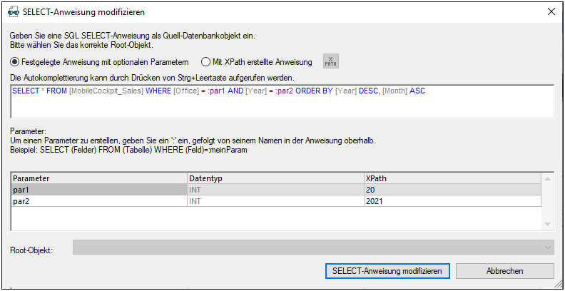Geben Sie im oberen Bereich die SELECT-Anweisung mit Hilfe der Datenbankabfragesprache SQL ein oder ändern Sie diese. In der Abbildung oben sehen Sie, dass Sie anstelle von Werten Parameter verwenden können. Um Parameter zu verwenden, geben Sie in die SELECT-Anweisung zuerst einen Doppelpunkt und anschließend einen Parameternamen ein, z.B. :par1. Im Bereich Parameter in der unteren Hälfte des Dialogfelds wird daraufhin automatisch ein Eintrag für diesen Parameternamen erstellt. Sie können hier für jeden Parameter den Datentyp des Parameters bearbeiten und mit Hilfe eines XPath-Ausdrucks einen Wert für den Parameter angeben.