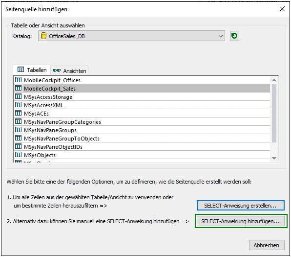 •Klicken Sie im Dialogfeld zur Auswahl einer Tabelle oder Ansicht (erste Abbildung in diesem Kapitel) auf SELECT-Anweisung hinzufügen.