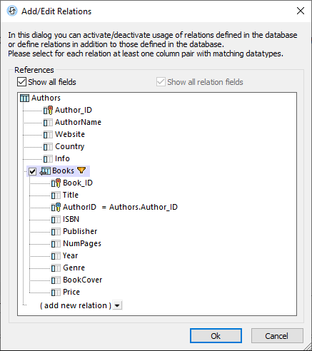 Wenn Tabellen in der Datenbank mit der Haupttabelle verknüpft sind, wird neben jeder dieser Tabellen ein Kontrollkästchen angezeigt. Sie können diejenigen Tabellen, für die die Beziehung beibehalten werden soll, auswählen. (Die Beziehungen werden mittels Primär- und Sekundärschlüssel erstellt). So hat etwa die Tabelle Books in der Abbildung links oben einen Sekundärschlüssel AuthorID, der die einzelnen Bücher-Datensätze mit einem Autor in der Tabelle Authors verknüpft. Wenn die Beziehung (durch Aktivierung der Tabelle Books) beibehalten wird, wird die Seitenquelle so erstellt, dass Books als Child hierarchisch mit Authors verknüpft ist. Ein Beispiel für die Verwendung einer hierarchischen Datenbank finden Sie im Tutorial Hierarchische Datenbank.