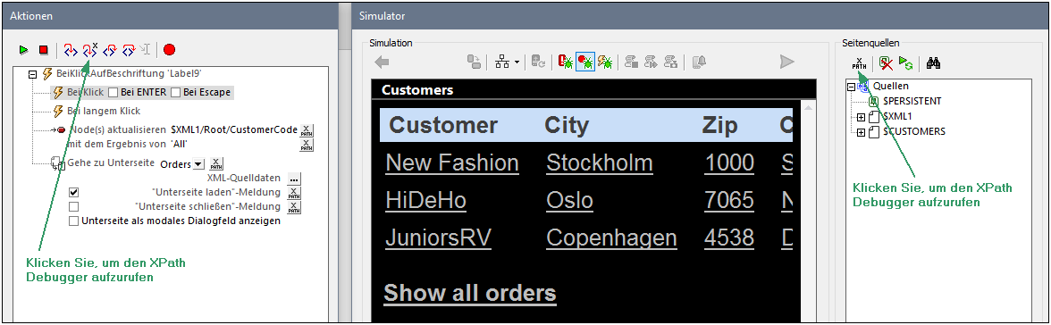 2.Bei der Ausführung einer Simulation: Sie können jederzeit während der Simulation einen neuen Ausdruck eingeben, um diese anhand einer XML-Datei, die Sie in den Debugger laden, zu debuggen. Klicken Sie zum Starten des XPath Debuggers im Fenster "Seitenquellen" auf die Schaltfläche XPath auswerten: (siehe Abbildung unten).
