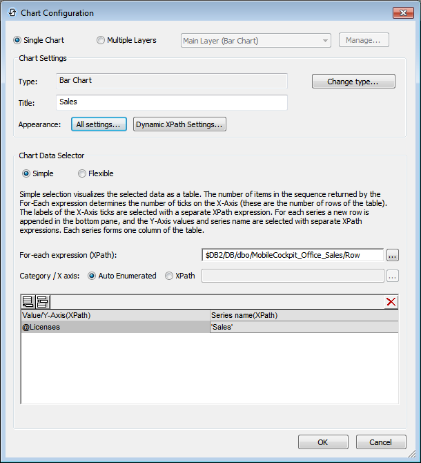 Ein Diagramm kann zum Zeitpunkt der Erstellung im Dialogfeld "Diagrammkonfiguration" (Abbildung unten) konfiguriert werden. Dabei müssen folgende Einstellungen vorgenommen werden: (i) Auswahl der Daten für die Achsen des Diagramms und (ii) Definition der Eigenschaften des Diagramms. Diese Einstellungen können zu einem späteren Zeitpunkt bearbeitet werden. Nachdem Sie dem Diagramm einen XML-Kontext-Node zugewiesen haben, rufen Sie das Dialogfeld "Diagrammkonfiguration" auf eine der folgenden Arten auf: