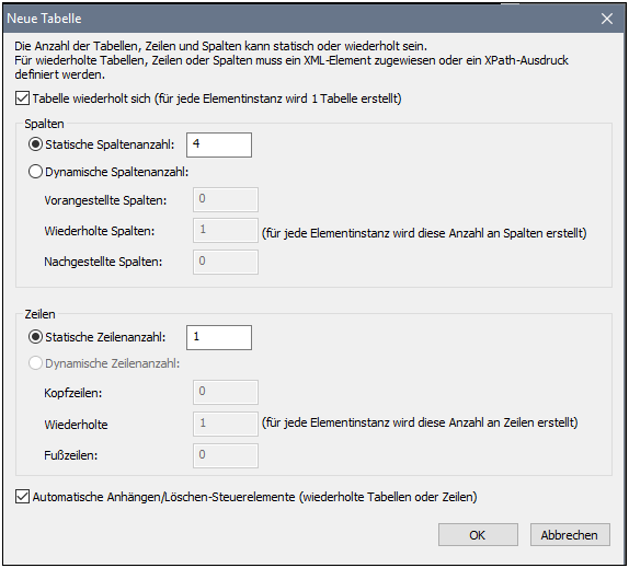 2.Definieren Sie die Anzahl der statischen Spalten und Zeilen für die sich wiederholende Tabelle. Sie können Spalten und Zeilen zu einem späteren Zeitpunkt über das Kontextmenü der Tabelle zur sich wiederholenden Tabelle hinzufügen.