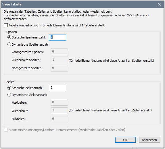 Eine Tabelle kann als statische Tabelle definiert werden, wenn das Steuerelement "Tabelle" in das Design gezogen wird. Sobald Sie die Maustaste nach dem Ziehen loslassen, wird das Dialogfeld "Neue Tabelle" angezeigt (Abbildung unten). Hier können Sie eine statische Anzahl von Spalten und Zeilen definieren. Wenn Sie auf OK klicken, wird eine statische Tabelle mit der angegebenen Anzahl von Spalten und Zeilen eingefügt. Sie können nun Inhalt zu den Zellen der Tabelle hinzufügen und Stileigenschaften für die Tabelle sowie für einzelne Spalten, Zeilen und Zellen definieren.