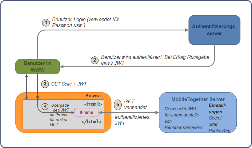 Eingebettete Webseiten-Lösungen können auch mittels JSON Web Tokens (JWT, empfohlene Aussprache wie Englisch: "jot") authentifiziert werden. Die Verarbeitung der JWT-Authentifizierung erfolgt dabei außerhalb des MobileTogether Server-Authentifizierungssystems. Für einen authentifizierten Benutzer wird ein JWT ausgestellt, welches über die Webseite an MobileTogether Server übergeben wird. Das JWT wird auf dem Server überprüft und außerdem geparst, um anhand dieser Informationen den Benutzer zu ermitteln. Wenn das JWT gültig ist, wird die Kommunikation zwischen der eingebetteten Lösung und dem Server für den im JWT definierten Benutzer fortgesetzt.