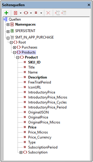•Kaufdaten werden vom App Store normalerweise in Form eines JSON-String gesendet. MobileTogether ruft Datenpunkte aus diesen Kaufdaten ab und speichert sie für jeden Kauf in den Attributen eines Purchase-Elements. Auf Android- und Windows-Systemen wird der JSON-Originalstring in einem @OriginalJSON Attribut des Purchase-Elements gespeichert, während der JSON-Originalstring auf iOS-Systemen als Attribut des Elements Purchases gespeichert wird. Der Grund dafür ist, dass der Apple Store bei Abfrage der Kaufdaten eines Endbenutzers die Daten aller Käufe und nicht die Daten der einzelnen Käufe separat zurücksendet (siehe Beschreibung der Aktion Käufe wiederherstellen). Eine Beschreibung, wie Sie Käufe vom Google- und Windows App Store abfragen, finden Sie im Kapitel Käufe abfragen.