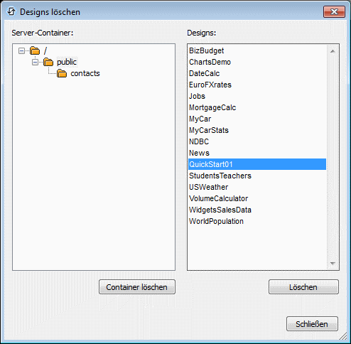 Wenn Sie auf Fortfahren klicken, wird ein Fenster mit den MobileTogether Server-Ordnern (Containern) und ihren Lösungen (Designs) angezeigt (Abbildung unten). Navigieren Sie zum gewünschten Container oder Design, wählen Sie ihn/es aus und klicken Sie auf Container löschen bzw. Löschen.
