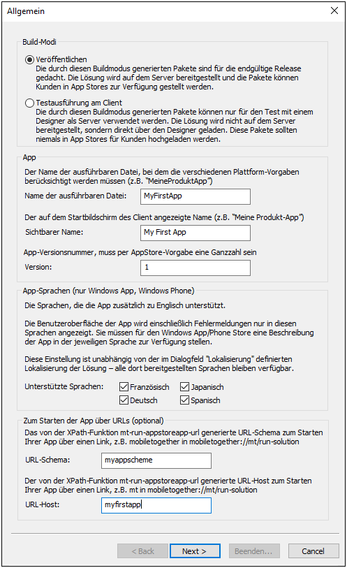 Nachdem Sie den Assistenten beendet haben, wird der Workflow der App auf dem Server bereitgestellt und der Programmcode für die ausgewählten App-Formate generiert.