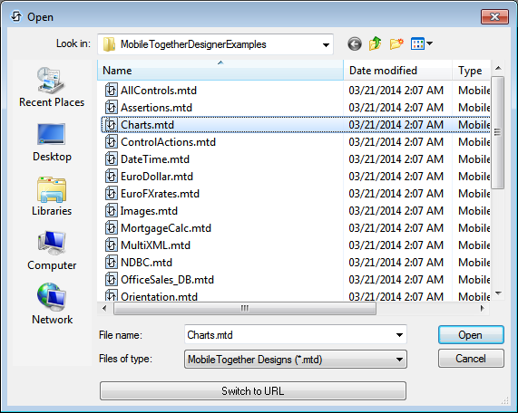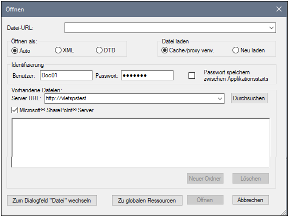 In einer Reihe von "Datei öffnen" und "Datei speichern" Dialogfeldern können Sie die gewünschte Datei über eine URL auswählen oder speichern (siehe Abbildung unten). Klicken Sie auf den Befehl Zu URL wechseln, um zum Auswahlverfahren zu wechseln. Um eine Datei über eine URL auszuwählen, gehen Sie folgendermaßen vor:
