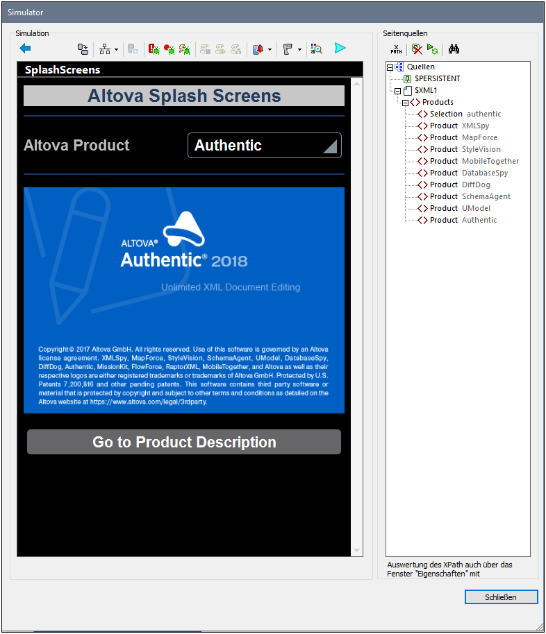 Startet den lokalen (MobileTogether Designer) Simulator zum Testen der Lösung in einem separaten Fenster (siehe Abbildung unten). Im Simulator wird der Workflow des aktiven Projekts Schritt für Schritt durchlaufen. Es wird der gerade in der Geräteauswahl der Symbolleiste "Seiteneinstellungen" ausgewählte Client simuliert.