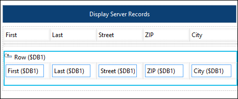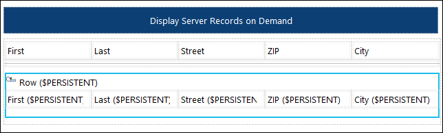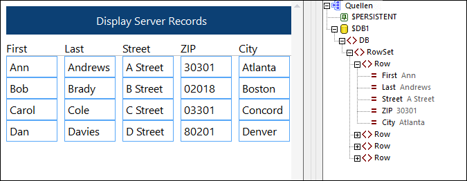 Beachten Sie in den Screenshots der Designs, dass die Zellen der Tabelle in 02-DisplayRecords.mtd (2) mit der Seitenquelle $DB1 (Abbildung links unten) verknüpft sind, während die Zellen der Tabelle in 03-DisplayOnDemand.mtd (3), mit der Seitenquelle $PERSISTENT (Abbildung rechts unten) verknüpft sind. Aufgrund dieser Seitenquellen - $DB1 (die mit der Datenbank auf dem Server verknüpfte Seitenquelle) und $PERSISTENT (die Seitenquelle auf dem Client) - werden in der Tabelle die Daten aus der entsprechenden Seitenquelle angezeigt.