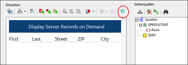 •In (3) werden Daten vom Server nur dann in $DB1 heruntergeladen, wenn auf die Schaltfläche Aktualisieren geklickt wird. Erst dann werden die Daten in $PERSISTENT kopiert und aufgrund des Seitenquellen-Link in der Tabelle angezeigt. Darum ist die Tabelle leer, bis der Benutzer auf die Schaltfläche Aktualisieren klickt.