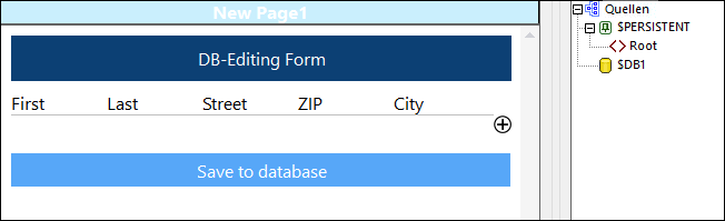 In der Beispiellösung 04-EditRecords.mtd (Design in der Abbildung unten) werden die Datenbankdaten in einer Tabelle angezeigt und können vom Benutzer bearbeitet werden. Felder der Tabelle sind mit der Seitenquelle $PERSISTENT verknüpft. Das bedeutet, dass (i) in der Tabelle der Inhalt von $PERSISTENT angezeigt wird und (ii) dass Ihre Bearbeitungen an der Tabelle in $PERSISTENT gespeichert werden.