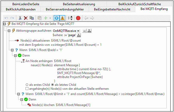 Beachten Sie, dass in der Nachricht enthaltene Informationen automatisch an die Seitenquelle $MT_MQTT übergeben werden. Diese Informationen enthalten zwei Bestandteile: (i) die MQTT-Nachricht, die als Textstring gespeichert wird, (ii) den Namen des Themas, zu dem die Nachricht gesendet wurde. Sie könnten die neue Nachricht nun zu einer XML-Datei hinzufügen, die alle Nachrichten enthält, die zu Themen auf dieser Seite abonniert und empfangen wurden. In der Abbildung unten sehen Sie eine Sequenz von Aktionen, die dies tut, indem an die Seitenquelle $XML1 ein neuer Message-Node angehängt wird und alle älteren Nachrichten gelöscht werden, falls für die Seitenquelle $XML1 ein Limit von einer einzigen Nachricht definiert wurde.