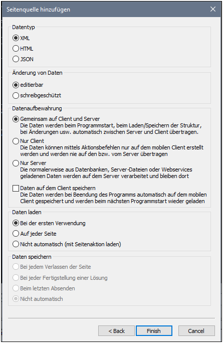 Sie haben die Wahl zwischen Editierbare XML- und Schreibgeschützte XML-Daten. Wenn eine Seitenquelle als editierbar erstellt wurde, können die Daten in den Nodes ihrer Baumstruktur geändert werden. Daten in schreibgeschützten Seitenquellen können nicht bearbeitet werden. Beide Arten von Seitenquellen können verwendet werden, um Daten anzuzeigen. Wenn der Endbenutzer jedoch auch Schreibrechte für Daten-Nodes benötigt, erstellen Sie die Seitenquelle als editierbare XML-Daten.