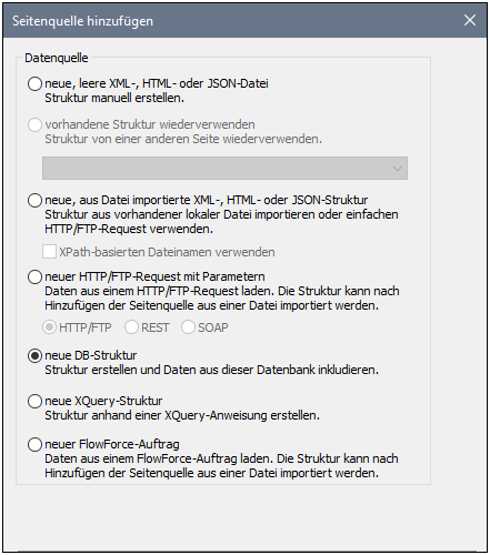 Mit dieser Option können Sie anhand einer Datenbank (DB) eine Seitenquellstruktur erstellen und Daten aus dieser Datenbank hinzufügen. Wählen Sie im ersten Bildschirm des Dialogfelds "Seitenquelle hinzufügen" (siehe Abbildung unten) die Option Neue DB-Struktur.