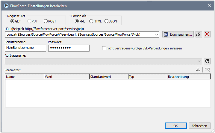 Wenn Sie auf die Schaltfläche Fertig stellen klicken, wird das Dialogfeld "FlowForce-Einstellungen bearbeiten" (Abbildung unten) angezeigt. Geben Sie die FlowForce-Einstellungen zur Herstellung einer Verbindung zu einem FlowForce Server und -Dienst ein. Wenn Sie eine URL eingeben und anschließend auf die Aktualisieren-Schaltfläche des Auftragsnamens klicken, wird eine Verbindung zum FlowForce Server hergestellt und die verfügbaren Aufträge werden angezeigt. Wenn Sie einen Auftrag auswählen, werden seine Parameter angezeigt und Sie können die gewünschten Parameterwerte eingeben. Wenn die FlowForce Server-URL jedoch mit Hilfe eines XPath-Ausdrucks erstellt werden soll, müssen Sie den Auftragsnamen in der URL angeben und die Parameter und deren Werte manuell im Bereich Parameter eingeben.