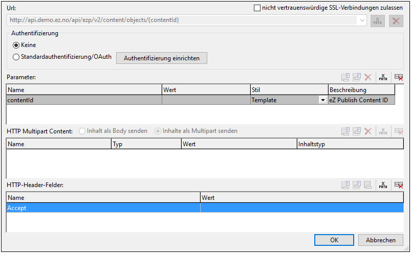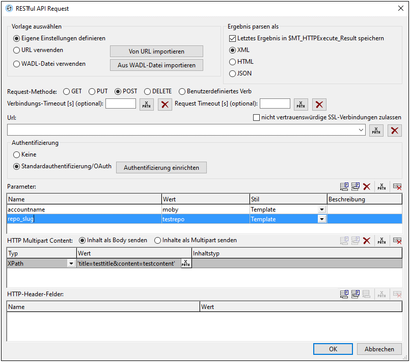 Wählen Sie die gewünschte Methode aus und klicken Sie auf OK. Die URL der Ressource wird in das Feld "URL" der Vorlage eingegeben und die Parameter und der in der WADL-Datei für diese Ressource definierte HTTP-Inhalt und die HTTP-Header werden in die entsprechenden Tabellen der Vorlage eingegeben (siehe Abbildung unten). Sie können in der Vorlage die Werte der Parameter und HTTP-Inhalt und Header eingeben, Parameternamen können jedoch nicht bearbeitet und Parameter können nicht gelöscht werden.