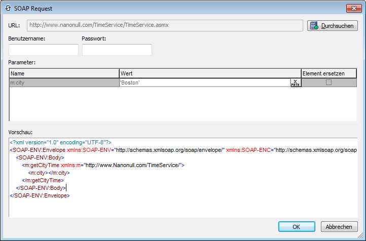 4.Daraufhin wird das Dialogfeld "SOAP Request" (Abbildung unten) angezeigt. Die URL im Feld URL ist die URL des Webservice. Im Vorschaubereich sehen Sie den Text des SOAP Request. Wenn der Request Parameter enthält, so werden diese im Bereich "Parameter" aufgelistet und Sie können einen XPath-Ausdruck eingeben, mit dem der Wert des Parameters generiert wird. So hat z.B. der Parameter m:city in der Abbildung unten einen Wert erhalten, der durch den XPath-Ausdruck "Boston" generiert wird. Wenn Sie Authentifizierungsinformationen eingeben müssen, um Zugriff auf den Webservice zu erhalten, geben Sie Ihren Benutzernamen und Ihr Passwort in die entsprechenden Felder ein. Rechts vom Feld "URL" befindet sich eine Durchsuchen-Schaltfläche. Klicken Sie darauf, um eine andere WSDL-Datei auszuwählen und einen anderen SOAP Request durchzuführen.