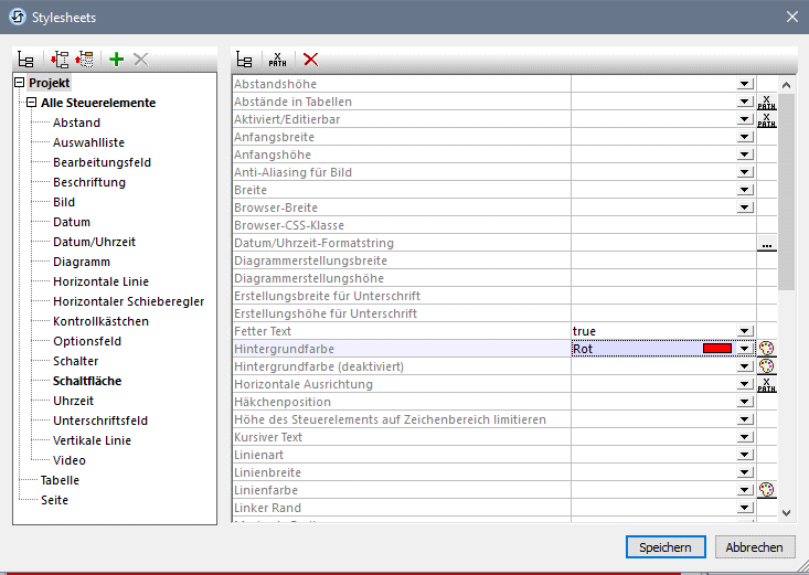 Die Eigenschaften, die auf der Ebene Stylesheet zur Verfügung stehen, sind alle Eigenschaften der Ebene Alle Steuerelemente - plus die Tabellen- und Seiteneigenschaften (mit denen die Eigenschaften für Tabellen bzw. Seiten definiert werden). Wenn Sie z.B. die Eigenschaft Hintergrundfarbe auf Stylesheet-Ebene definieren (z.B. mit dem Wert Rot, wie in der Abbildung unten links), so erhalten alle Steuerelementtypen der Ebene 3, die die Eigenschaft Hintergrundfarbe haben, plus alle Tabellen im Design sowie die Design-Seite selbst diesen Wert (in diesem Fall Rot), solange keine Definition für diese untergeordneten Eigenschaften vorhanden ist.