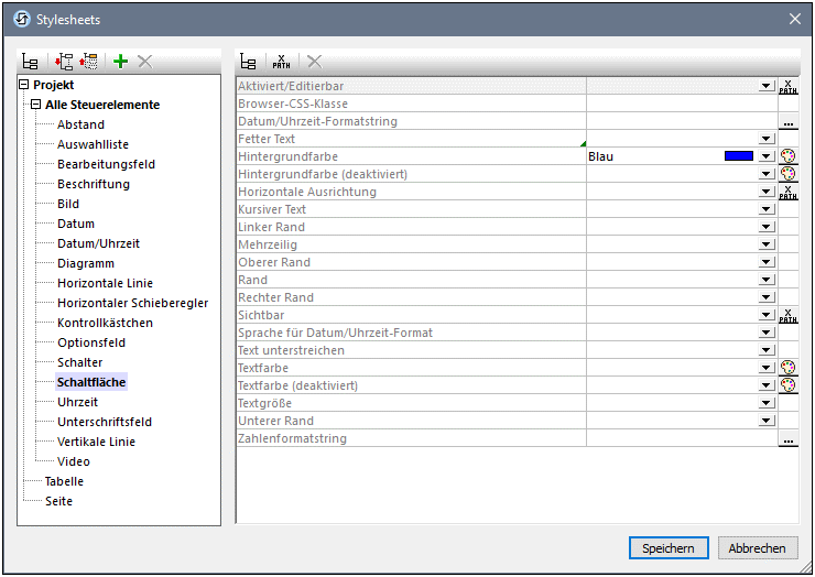 Stylesheet | Seiteninstanz; alle Tabellen und alle Steuerelemente auf der Seite | Tabelleninstanz; alle Steuerelemente in der Tabelle | Steuerelementinstanz |