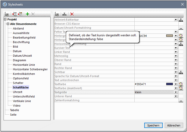 Sie können in einem Stylesheet Stile für einzelne Steuerelementtypen (wie z.B. Schaltflächen-Steuerelemente und Beschriftungs-Steuerelemente), für Tabellen und Seiten definieren. Wählen Sie dazu die gewünschte Designkomponente im linken Bereich aus. In der Abbildung unten sehen Sie, dass der Steuerelementtyp "Schaltfläche" ausgewählt wurde. Die Eigenschaften der ausgewählten Designkomponente werden im Bereich auf der rechten Seite angezeigt. Sie können nun Werte für einzelne Eigenschaften auswählen oder eingeben. Klicken Sie anschließend auf Speichern.