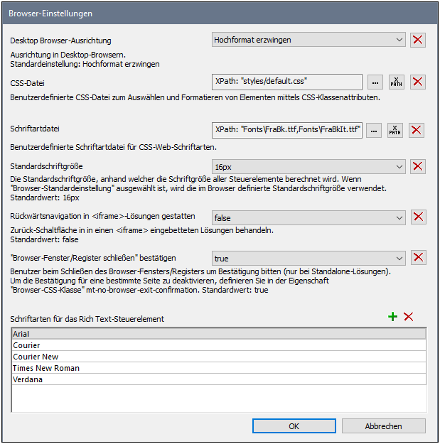 CSS-DateiDefiniert nur für die Stildefinition in Webclients, d.h. im Browser, die externe CSS-Datei, die zur Auswertung der CSS-Eigenschaften, die den Klassenselektoren von Steuerelementen im Design zugewiesen wurden, gelesen wird. Um das Aussehen von Designkomponenten zu ändern, kann die externe CSS-Datei jederzeit geändert werden. Jede Komponente im Design hat eine Eigenschaft namens Browser-CSS-Klasse, mit der ein CSS-Klassenname für dieses Steuerelement definiert wird. Anschließend können für diese Klassenselektoren in einer externen CSS-Datei CSS-Eigenschaften definiert werden. Diese CSS-Datei wird auf dem Server bereitgestellt. Die CSS-Datei, die nach den Klassenregeln durchsucht werden soll, wird in dieser Einstellung (CSS-Datei) definiert. Sie können die CSS-Datei über einen Dateipfad oder einen globalen Ressourcen-Aliasnamen auswählen. Sie können den Dateipfad auch mit Hilfe eines XPath-Ausdrucks generieren (siehe Abbildung oben). Beachten Sie die folgenden Punkte: (ii) Die in der externen CSS-Datei definierten CSS-Regeln haben eine niedrigere Priorität als die in den Eigenschaften eines Steuerelements definierten; (ii) die CSS-Datei steht in Simulationen für Webbrowser nicht zur Verfügung.