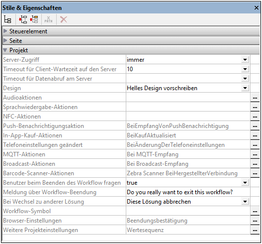 Wenn eine Telefoneinstellung geändert wurde, handelt sich dies um ein Ereignis (BeiÄnderungDerTelefoneinstellungen), für das Sie eine Gruppe der Standardaktionen auslösen lassen können. Klicken Sie auf die Schaltfläche Zusätzliche Optionen rechts von der Projekteigenschaft, um eine Gruppe von Aktionen zu definieren, die bei Auslösung dieses Ereignisses ausgeführt werden sollen. Das Ereignis würde ausgelöst, wenn Telefoneinstellungen wie z.B. das Design oder die Sprache geändert wurden.