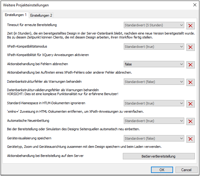 Wenn Sie auf die Schaltfläche Zusätzliches Dialogfeld der Eigenschaft Weitere Projekteinstellungen klicken, wird das gleichnamige Dialogfeld aufgerufen (Abbildung unten). Beachten Sie, dass die Einstellungen auf zwei Registern vorgenommen werden: Es können die folgenden Einstellungen definiert werden:
