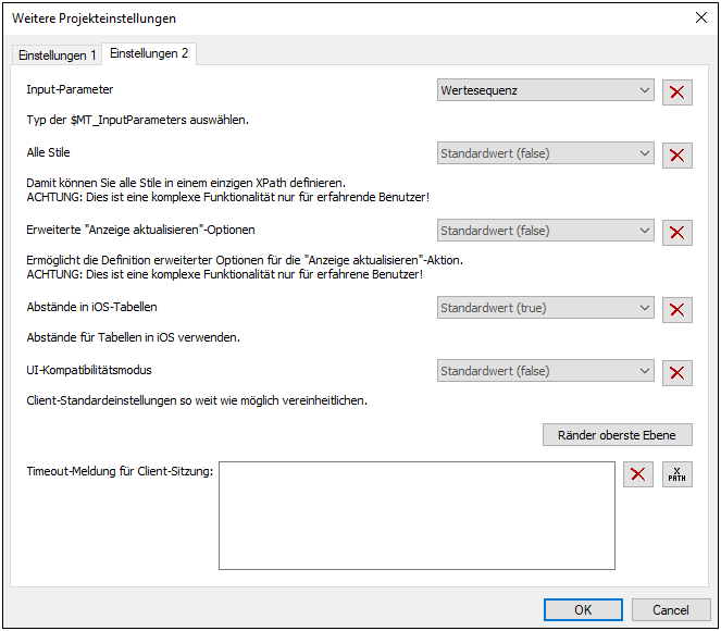•Timeout-Meldung für Client-Sitzung: Sie können eine Meldung eingeben, die auf dem Client-Gerät angezeigt werden soll, wenn es zu einem Server-Timeout gekommen ist. Die Meldung kann entweder direkt eingegeben oder als Ergebnis der Auswertung eines XPath-Ausdrucks definiert werden.