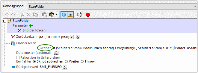 •Der auszulesende Ordner wird in der Einstellung Ordner der Aktion Ordner lesen definiert (in der Abbildung oben grün umrandet). In unserem Beispiel wird er mit Hilfe eines XPath-Ausdrucks definiert, mit dem für jede Auswahl (Books, Films und Music) ein anderer Ordner gelesen wird. Beachten Sie, dass in den Bedingungen des XPath-Ausdrucks (siehe Abbildung unten) die Variable $FolderToScan verwendet wird, die die Auswahl des Benutzers enthält (Books, Film oder Music), die von der aufrufenden Lösung gesendet wird.