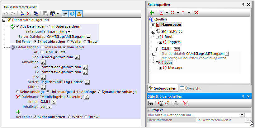4.Im linken Bereich des Dialogfelds (in der Abbildung oben nicht sichtbar) werden alle für Dienste verfügbaren Aktionen angezeigt. Aktionen, die nicht zur Verfügung stehen, sind deaktiviert (und ausgegraut). Ziehen Sie die Aktionen, die als Dienst ausgeführt werden sollen, auf das Register BeiGestartetemDienst. Diese Aktionen bilden die Dienst-Aktionsstruktur. In der Abbildung oben wurden zwei Aktionen hinzugefügt: (i) Aus Datei laden lädt die MobileTogether Server-Log-Datei in die Seitenquelle $XML1 und (ii) E-Mail senden sendet E-Mails an drei Empfänger, wobei die $XML1-Struktur des MobileTogether Server-Log als Anhang angehängt wird.