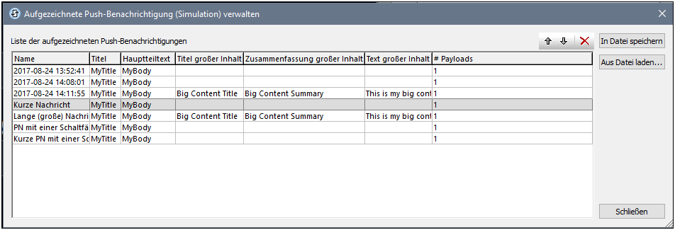 Im Dialogfeld "Aufgezeichnete Push-Benachrichtigung (Simulation) verwalten" (Abbildung oben) wird jede aufgezeichnete PN mit ihrem Namen, den Daten der kurzen Nachricht, den Daten der großen Nachricht und den Payload-Daten in einer separaten Zeile angezeigt. Sie können die Reihenfolge der PNs ändern, indem Sie eine oder mehrere davon auswählen und (rechts oben) in der Symbolleiste auf die Schaltflächen Nach oben und Nach unten klicken. Sie können eine PN löschen, indem Sie sie auswählen und auf die Symbolleisten-Schaltfläche Löschen klicken. Sie können auch die Namen der PNs bearbeiten, um sie leichter voneinander unterscheiden zu können. Doppelklicken Sie dazu auf den Namen und bearbeiten Sie ihn. Änderungen, die Sie in diesem Dialogfeld vornehmen, werden im Arbeitsspeicher gespeichert. Um die Änderungen in der MTD-Datei zu speichern, klicken Sie auf In Datei speichern.