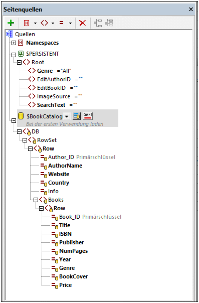 •Sowohl $BookCatalog als auch $EditBook basieren auf derselben BookCatalog.sqlite-Datenbank. Jede Seitenquelle wurde jedoch anders konfiguriert. Während in die Seitenquelle $BookCatalog alle Datensätze der Datenbank importiert werden, enthält die Seitenquelle $EditBook der Seite Editing Page nur das zur Bearbeitung ausgewählte Buch. Nähere Informationen zur Definition dieser Seitenquellen finden Sie in den Kapiteln Die Hauptseite "Main Page": Übersicht und Die Bearbeitungsseite "Editing Page": Übersicht.