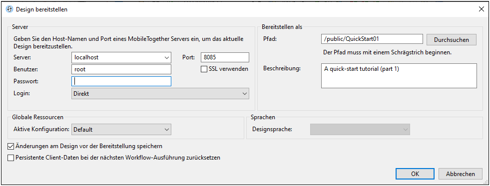 9.Klicken Sie anschließend auf OK. Das Projekt und die für die Bereitstellung ausgewählten Dateien werden nun als der Workflow QuickStart01 auf MobileTogether Server bereitgestellt.