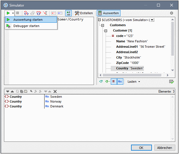 •Im XPath Debugger können Sie Schritt für Schritt durch die Auswertung eines XPath-Ausdrucks steigen, um zu sehen, wie der Ausdruck verarbeitet wird. Anschließend können Sie die Ausdruck nach Bedarf ändern. Um den XPath Debugger auszuwählen, klicken Sie in der Symbolleiste auf Auswerten und wählen Sie anschließend im Dropdown-Menü von Auswertung/Debugging starten den Befehl Debugger starten (siehe Abbildung oben). Wählen Sie alternativ dazu einfach Debugger starten aus.