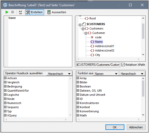 •Eine Schemstruktur zum Auswählen und Eingeben von Element- und Attribut-Nodes. Wenn das Kontrollkästchen Relativer XPath (wie in der Abbildung oben) aktiviert ist, so wird der Pfad zum ausgewählten Node relativ zum Kontext-Node (dem Node im Design, in dem der XPath-Ausdruck erstellt wird) eingegeben. Der Kontext-Node wird unterhalb des Schemastrukturbereichs angezeigt. In der Abbildung oben sehen Sie, dass der Kontext-Node das Element Customer ist. Außerdem sehen Sie an der Titelleiste des Fensters, dass dieser XPath-Ausdruck für die Eigenschaft Text des Steuerelements Label3 erstellt wird. Wenn das Kontrollkästchen Relativer XPath deaktiviert bleibt, wird ein absoluter XPath-Ausdruck zum ausgewählten Node eingegeben; ein solcher Ausdruck würde beim Dokument-Root-Element beginnen, z.B: $CUSTOMERS/Customers/Customer/Name.