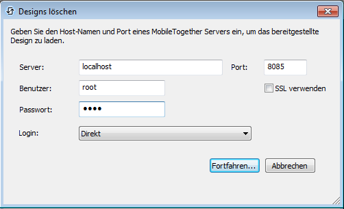 •Servername und Port: Der Port bezieht sich auf den MobileTogether Server Administrator-Port und muss mit der Administrator-Ports-Einstellung von MobileTogether Server übereinstimmen. Wenn Sie SSL verwenden, vergewissern Sie sich, dass Sie den sicheren Port von MobileTogether Server verwenden.