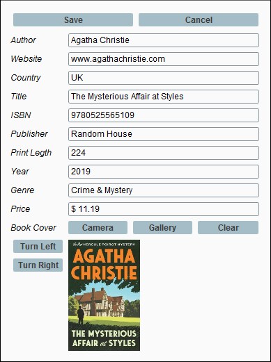Auf der Seite Editing Page wird das zu bearbeitenden Buch (das auf der Hauptseite angeklickte Buch) angezeigt. Die Buchinformationen können bearbeiten und wieder in der Datenbank gespeichert werden. In den Abbildungen unten sehen Sie das Seitendesign (links) und die Seite in einer Simulation (rechts).