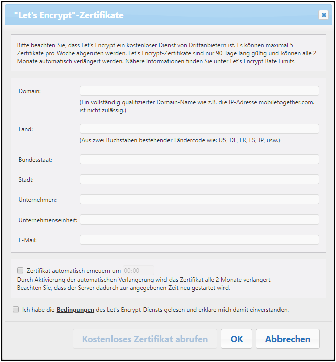 Geben Sie die erforderlichen Informationen in das Dialogfeld ein und aktivieren Sie die Einverständniserklärung zu den Bedingungen. Let's Encrypt-Zertifikate sind 90 Tage lang gültig, daher bietet MobileTogether Server die Option, das Zertifikat automatisch alle zwei Monate (am Tag, an dem Sie das Zertifikat erhalten haben) zu erneuern. Aktivieren Sie diese Option, falls Sie diese Möglichkeit nutzen möchten. Da der Server während der Zertifikatverlängerung einige Sekunden lang nicht zur Verfügung steht, können Sie auch den Verlängerungszeitpunkt zum Datum der Verlängerung auswählen. Klicken Sie nach dem Ausfüllen des Dialogfelds auf OK.