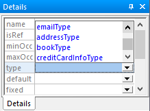 6.Wählen Sie, während dieses Element ausgewählt ist, in der Eingabehilfe "Details" den Eintrag addressType aus der Dropdown-Liste type aus. Der Typ "addressType" wird blau angezeigt, da er sich im SchemaAgent-Suchpfad befindet.