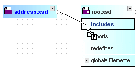 Nachdem Sie ein Schema in das Design-Fenster gezogen haben, können Sie Include-, Import- und Redefine-Anweisungen erstellen, indem Sie die referenzierten Schemas mittels Drag & Drop zum Design hinzufügen. Zu diesem Zweck verfügt jeder Schema- und .mfd-Dateikasten über einen Ziehpunkt am rechten Rand der Titelleiste.